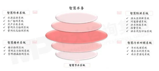 智慧水務系統(tǒng)由智慧給水、智慧排水、智慧防洪、智慧污水回用、智慧節(jié)水等五大子系統(tǒng)構成,每個子系統(tǒng)下又包含水源監(jiān)控、水廠檢測、用戶超表等不同功能模塊。