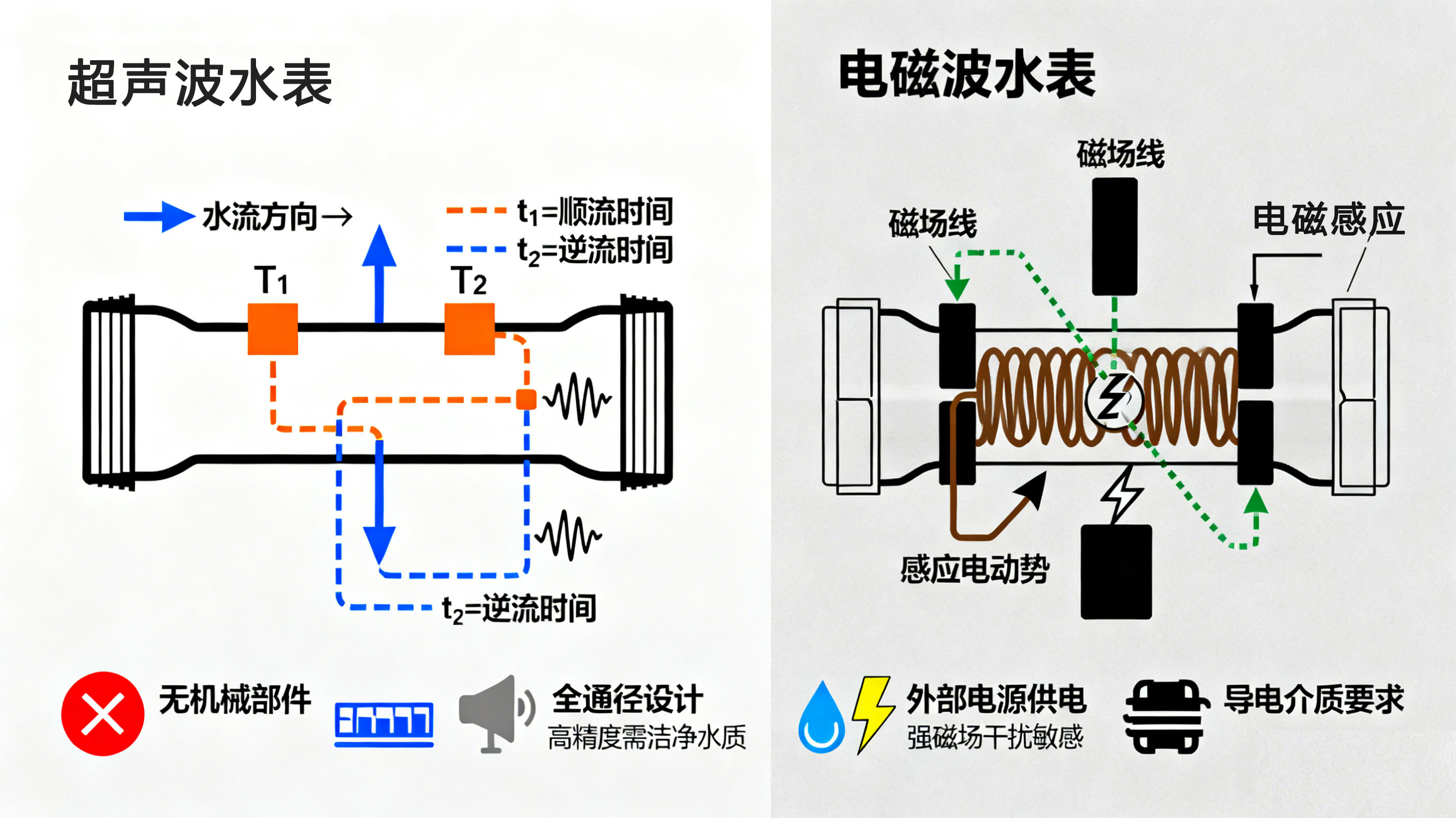 | 測量原理 | 法拉第電磁感應 | 超聲波時差法 |